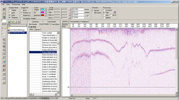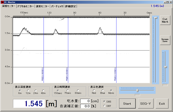 お手持ちのノートパソコンに接続して、簡単に測深機を構成できます。 本体サイズは 90mm(W)×164mm(H)×255mm(D)、重さは2.0kgと小型軽量です。 送受波器も直径6.6cm、重さ670g(ケーブル10m含む)と小型軽量です。 水深測量以外でも、環境調査、防災水利、治水対策などにご利用いただけます。 ※Windows7,Windows10 搭載パソコンで動作します。 ![]() ![]() ![]() ![]() ![]() ![]() パソコンに収録したデータは、後からフリーソフトウェアで表示・印刷できます。 ![]()